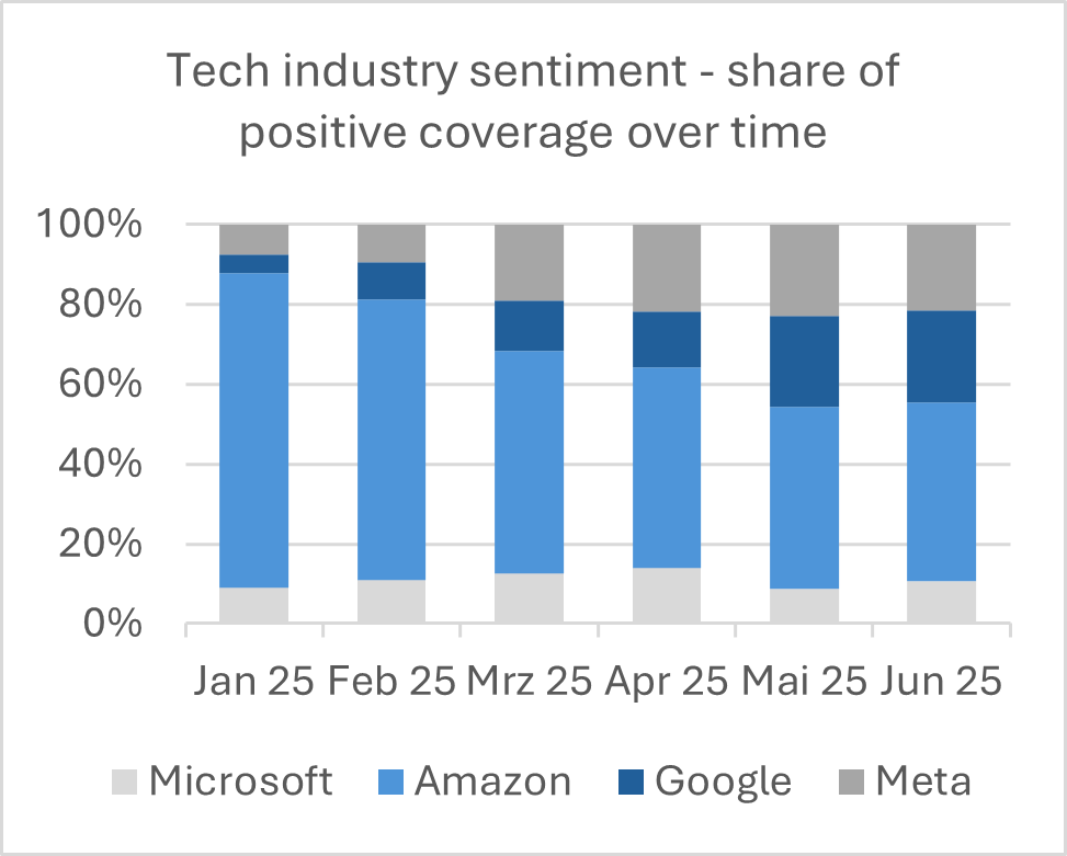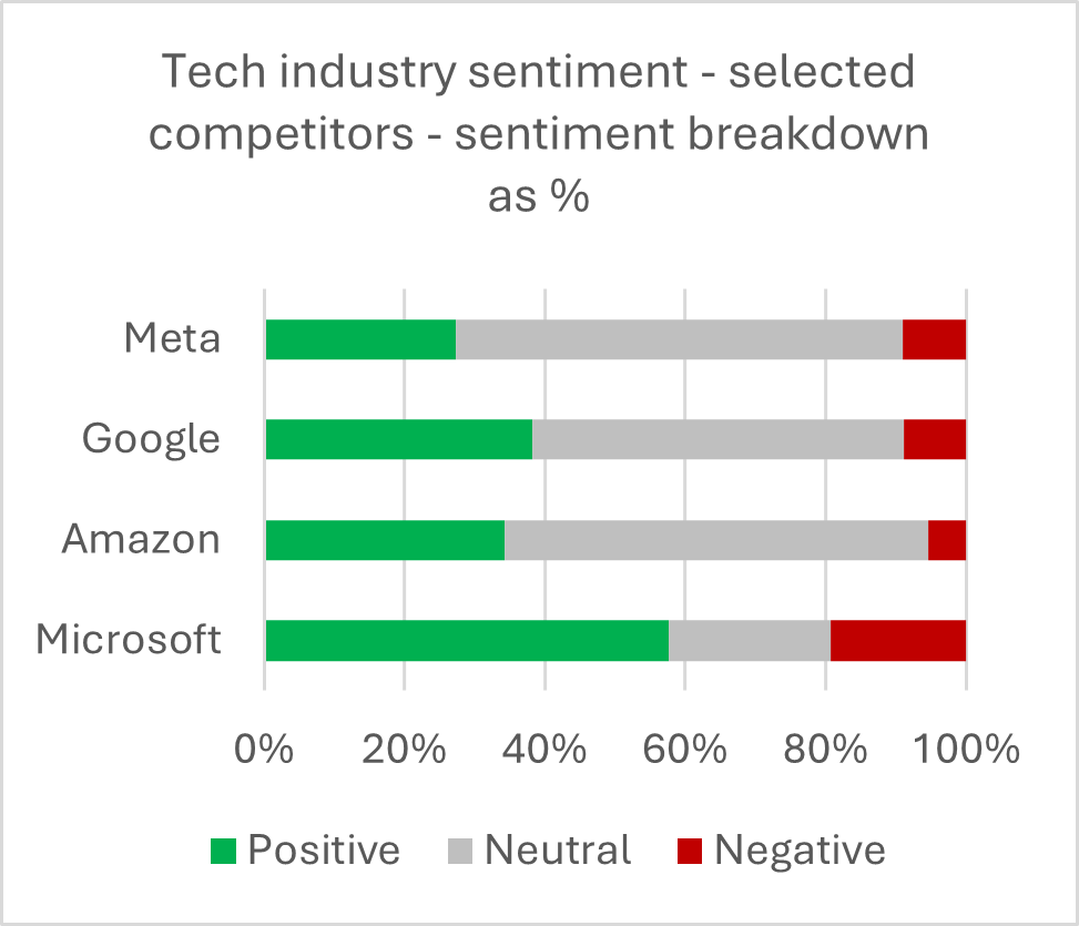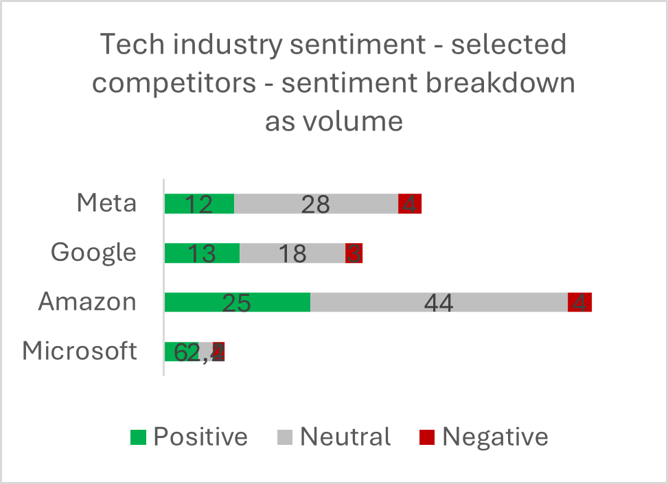 One chart shows Microsoft on top. Another which shows absolute volumes rather than sentiment breakdown as a percentage? Amazon. Add a timeline? Now Google looks like the future.